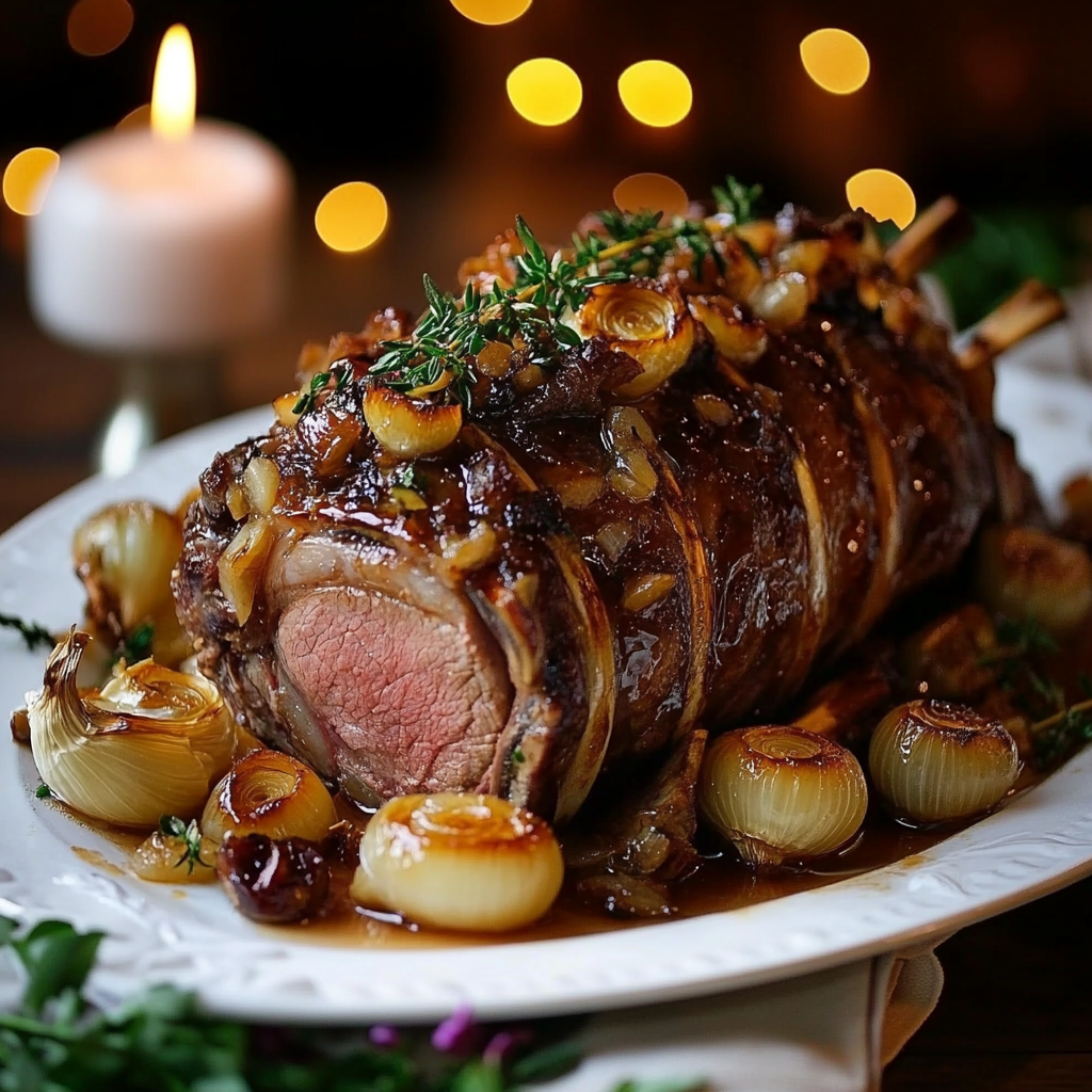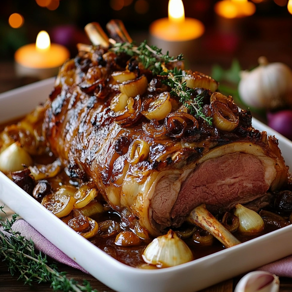 Slow-Roasted Lamb Shoulder with Roasted Garlic, Caramelized Onions & Honey Herb Glaze